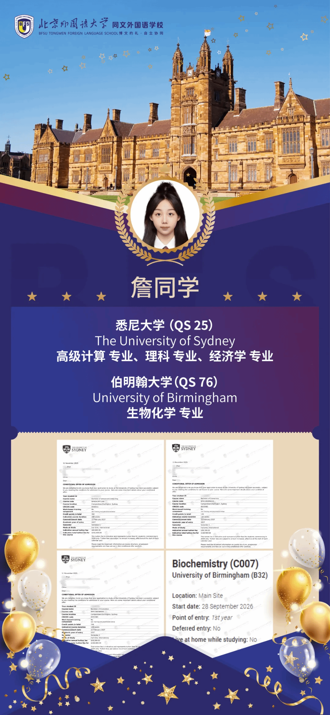 2026录取季刚刚拉开序幕,北外同文校园已佳音不断、硕果连连。我校多名学子凭借优异的学术成绩、出色的综合素养与鲜明的个人特质,在全球竞争中崭露头角,率先斩获多封澳大利亚八大名校的录取通知!热烈祝贺所有收获梦想offer的同学们!