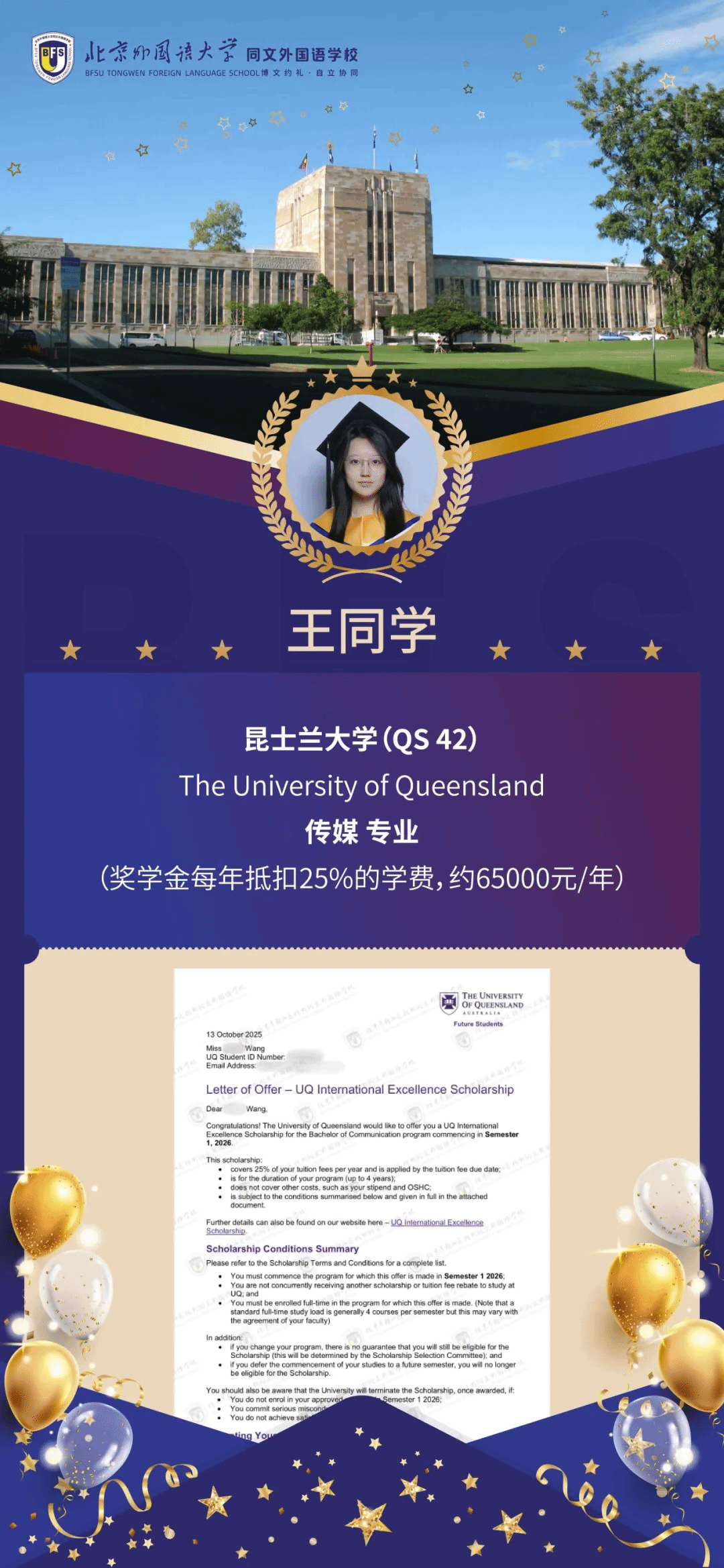 我校学子在首轮录取中,已成功收获包括:墨尔本大学(2026QS排名第19位)、悉尼大学(2026QS排名第25位)、昆士兰大学(2026QS排名第42位)、阿德莱德大学(2026QS排名第82位)等在内的多所八大名校录取,展现出北外同文学子扎实的学术底蕴和强劲的申请竞争力!