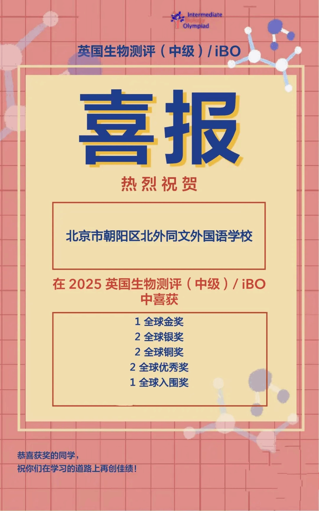 作为国际生物奥林匹克竞赛的重要预备赛事,其试题难度贴近国际赛事标准,着重考查学生的生物学科深度与拓展能力。我校学子深耕专业领域,以扎实的知识和严谨的思维喜获金奖(Gold)、银奖(Silver)、铜奖(Bronze)、优秀奖(Highly Commended)、入围奖(Commended)。