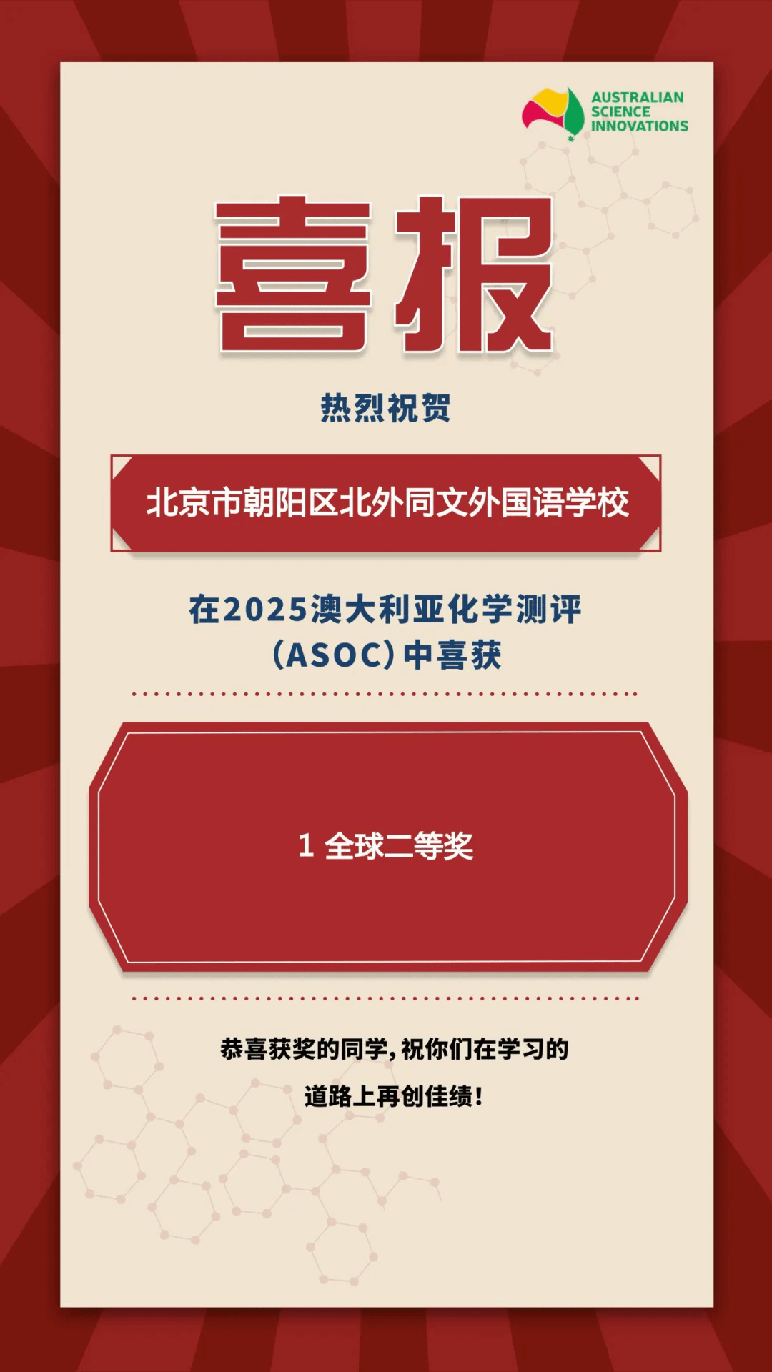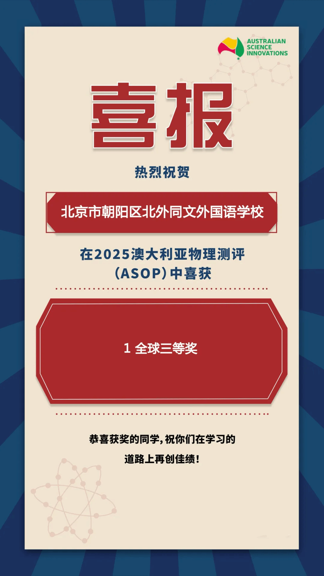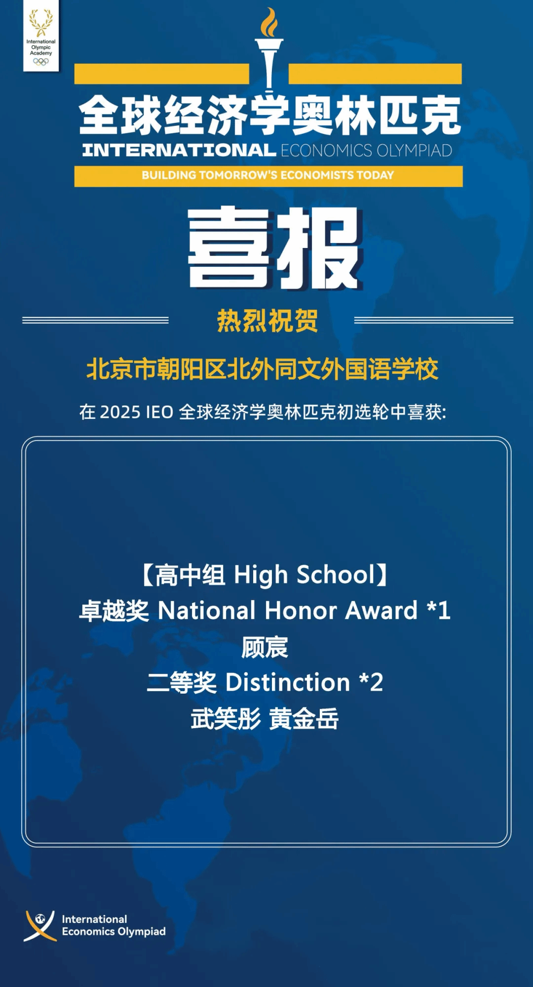 近日,2025年澳大利亚数学、生物、化学、物理测评及IEO全球经济学奥林匹克(初选轮)、英国生物测评(中级IBO)等多项国际学科竞赛成绩陆续揭晓。这些赛事以高含金量、高挑战性著称,是检验学生学科素养、创新思维与国际竞争力的重要平台。北外同文学子凭借扎实的知识根基、卓越的逻辑思辨能力和奋勇争先的拼搏精神,在全球参赛者中脱颖而出,斩获多项重磅荣誉,充分展现了我校学子的学术风采与综合实力!