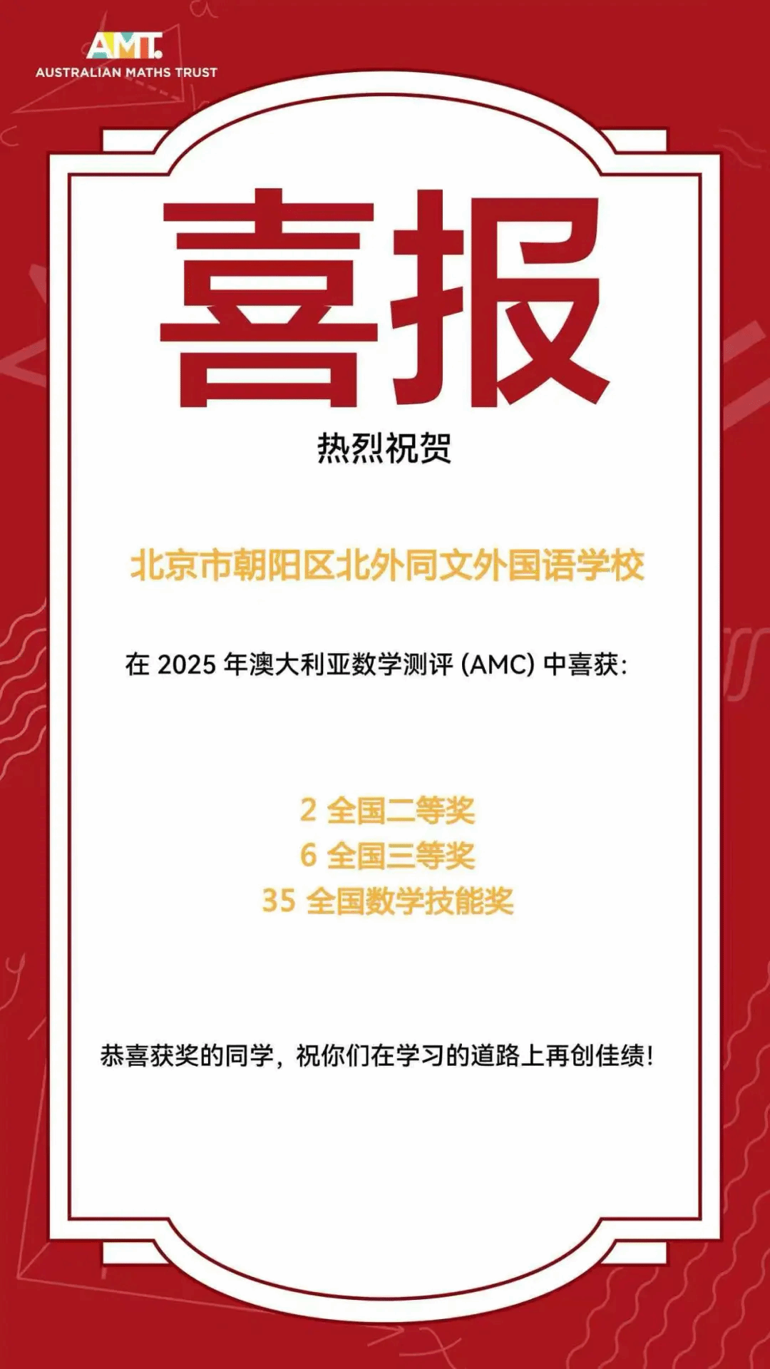 我校学子凭借敏锐的数学思维在赛事中表现亮眼,共摘得2项全国二等奖(National Distinction)、6项全国三等奖(National Credit)、35项全国数学技能奖(National Proficiency)。