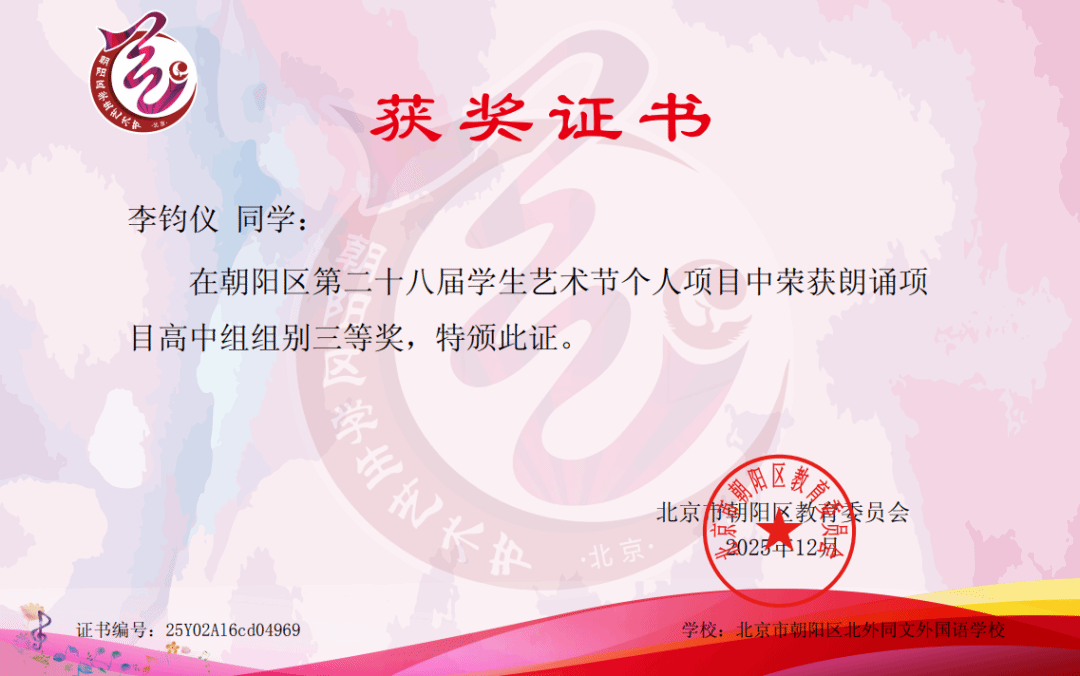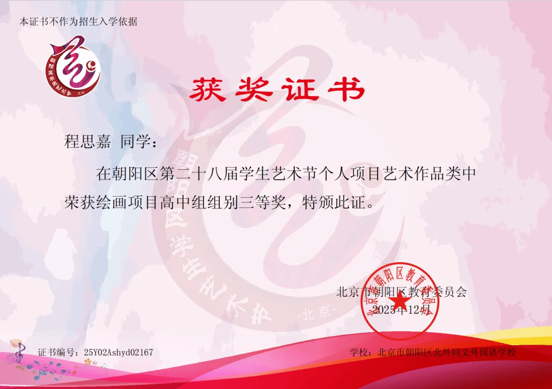 再次祝贺所有获奖同学!愿全体学子在艺术的道路上继续探索、勇敢表达,通过多元艺术形式启迪心灵、陶冶情操,让青春在美的熏陶中绽放更加夺目的光彩。北外同文也将继续拓展艺术教育资源,搭建更广阔的成长舞台,助力每一位学子在艺术滋养中成就梦想!