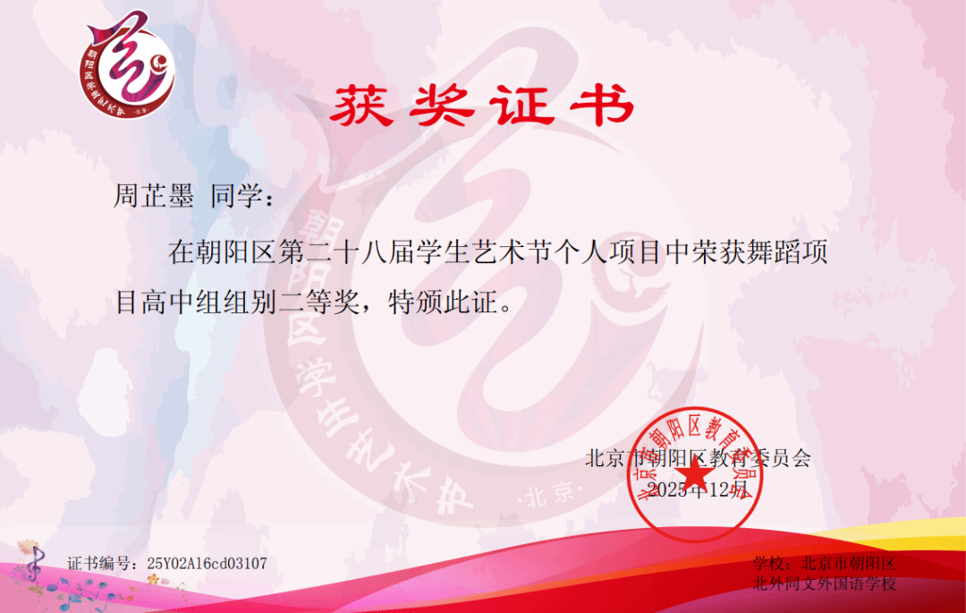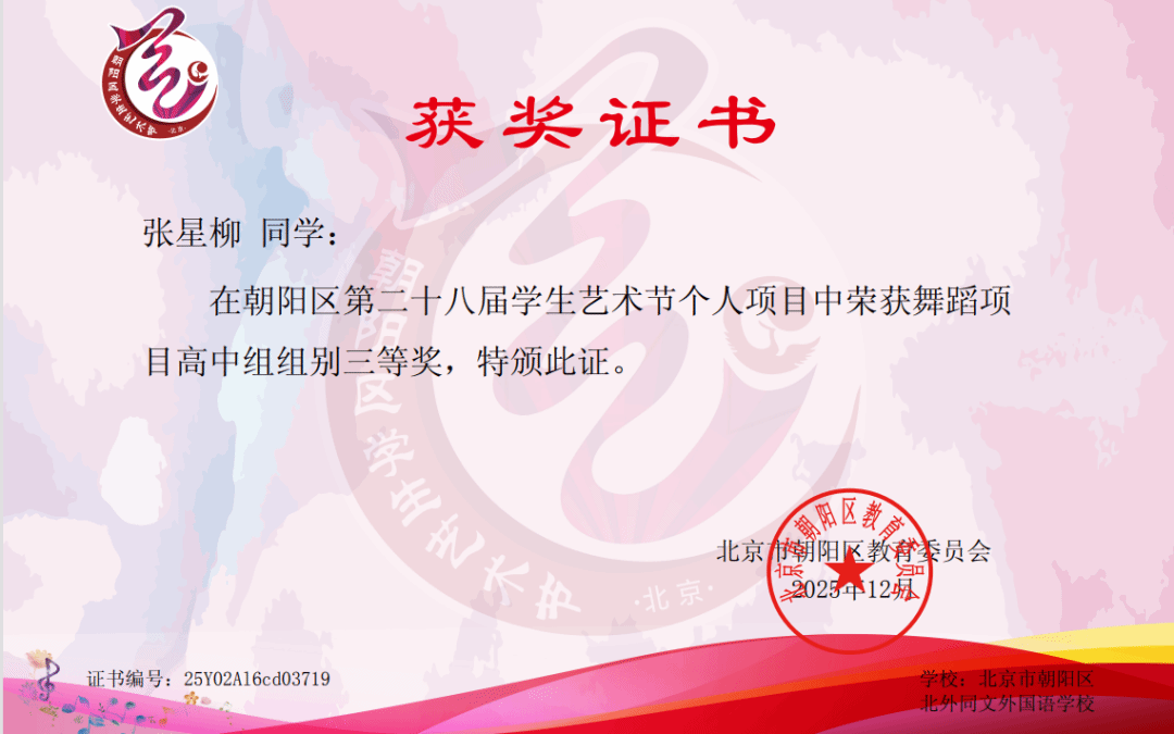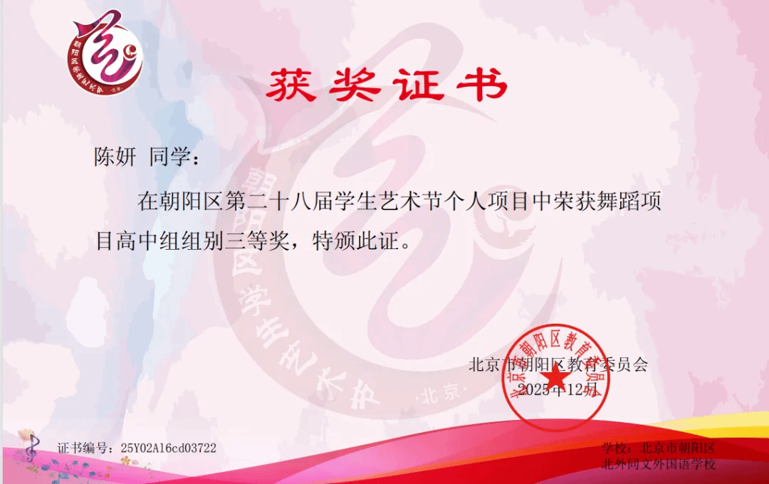 继音乐类项目喜获丰收之后,北外同文学子在北京市朝阳区教育委员会主办的第28届学生艺术节个人项目展演中再创佳绩!舞蹈、朗诵与美术三大类别的荣誉展现了我校美育实践的丰硕成果,实现了我校在艺术节个人项目奖项上的再次突破。