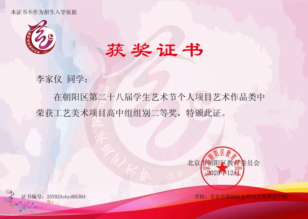 艺术作品类展演同样捷报传来!韩嘉仪同学荣获绘画项目高中组二等奖,李家仪同学荣获工艺美术项目高中组二等奖,程思嘉同学荣获绘画项目高中组三等奖。每一份荣誉的背后,都是学子们对艺术的执着追求与潜心打磨。