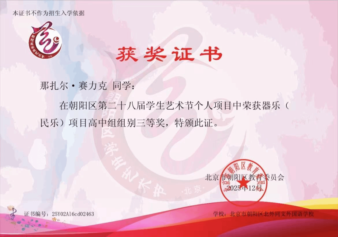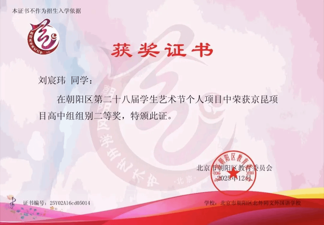 近日,在北京市朝阳区第二十八届艺术节个人项目展演中,我校学子凭借扎实的专业功底与出色的舞台表现斩获佳绩,荣获净昆类、钢琴类、民乐类多个奖项。