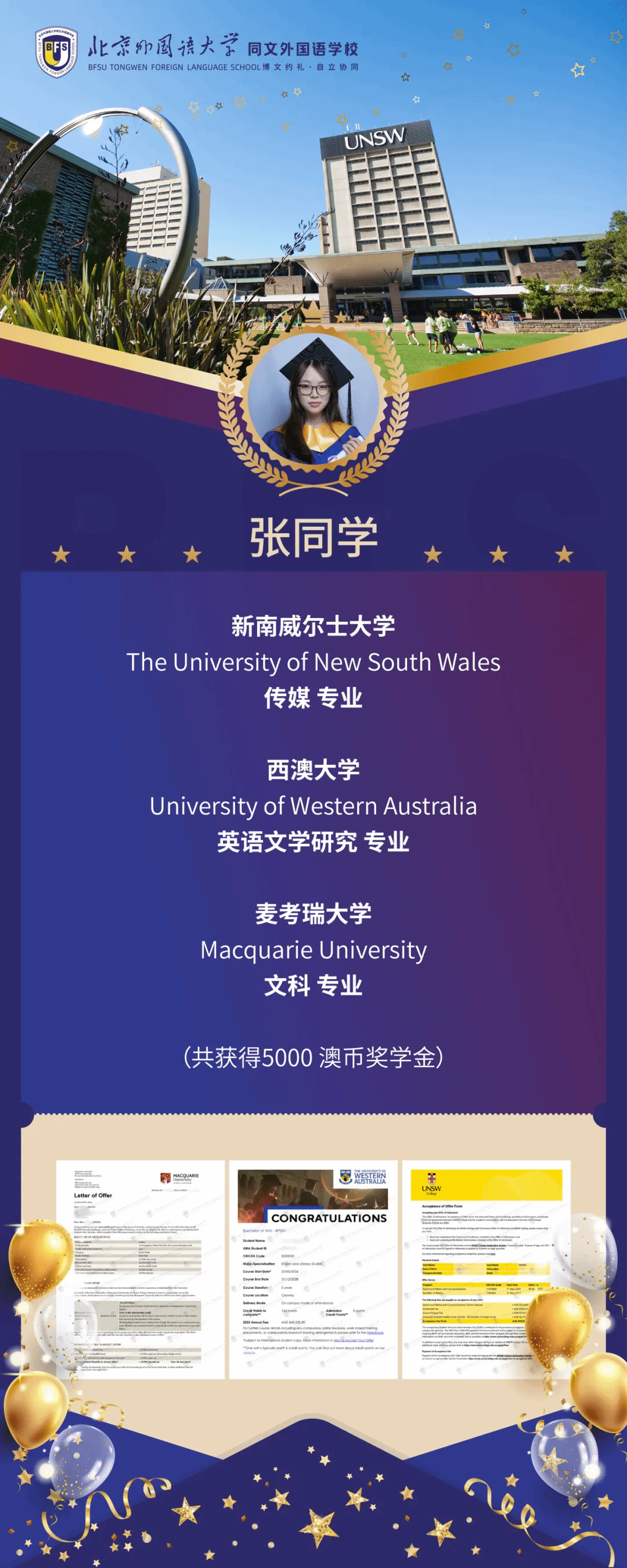 在学术表现之外,张同学的升学成绩同样亮眼。凭借扎实的学科基础与出色的综合素养,她已成功斩获新南威尔士大学、西澳大学、麦考瑞大学三所澳大利亚顶尖高校的录取通知书!
