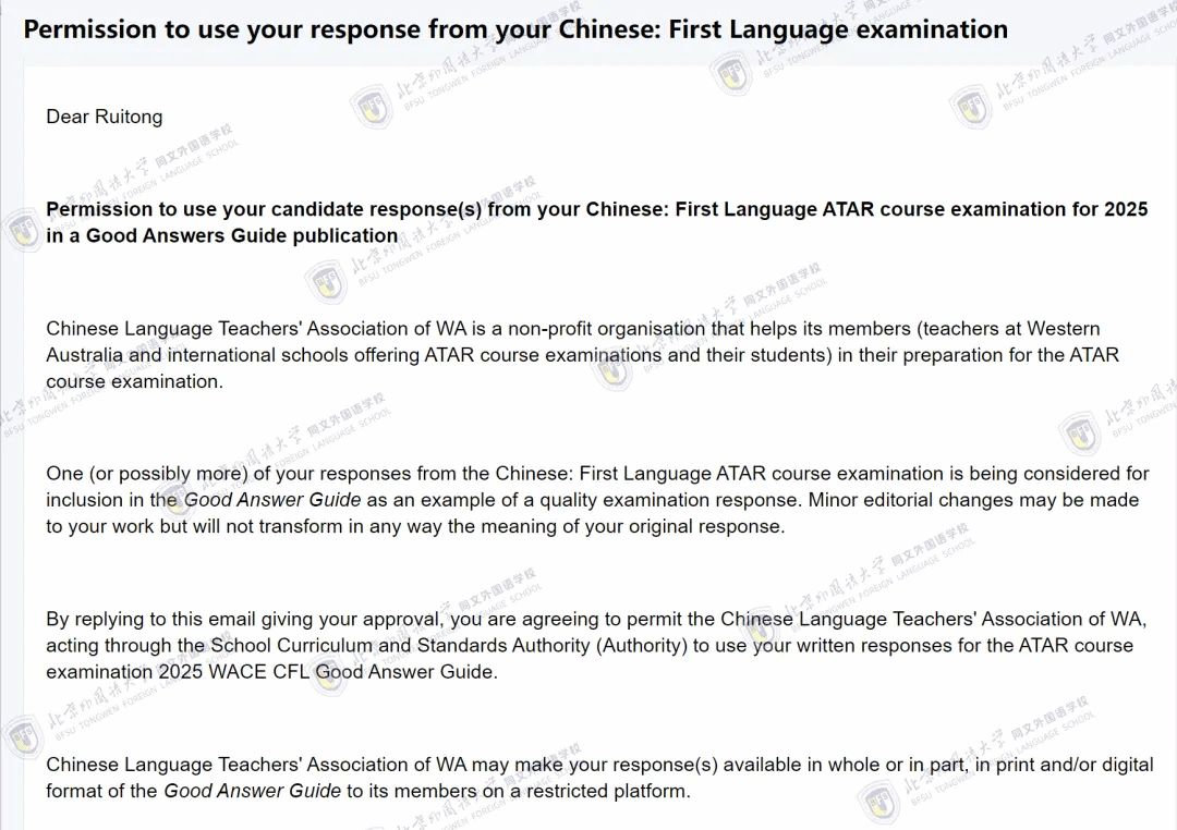 近日,我校学子张同学收到来自西澳汉语教师协会(Chinese Language Teachers' Association of WA)的正式邮件,其在2025年西澳CFL ATAR课程考试中的优秀作答,被选为高质量范例,收录于《2025年WACE CFL优秀答案指南》中。